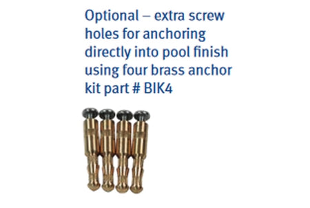 - Ideal for retrofitting over all existing sumps/frames up to 13" by anchoring directly into pool finish (plaster, tile, fiberglass, etc.) using four brass anchors and stainless screws in kit #BIK4