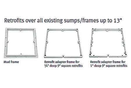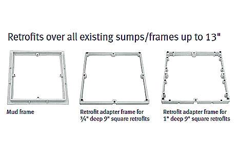 - Retrofit adapter frame easily and safely retrofits most brands’ existing 9" mud frame with epoxy or screws or both; cover anchors into in-molded brass inserts in frame with four fine thread machine screws