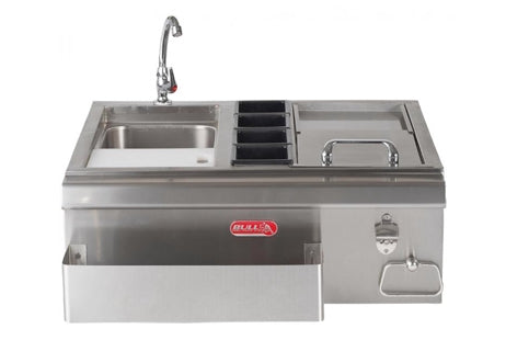 The 30" Bar Caddy is a larger caddy which includes a sink with a faucet, cutting board, removable condiment tray, ice chest with removable lid and a bottle opener for the ultimate grill master.