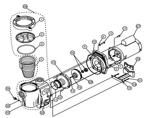 - Oversized strainer basket and volute - industry standard in pool pumps.